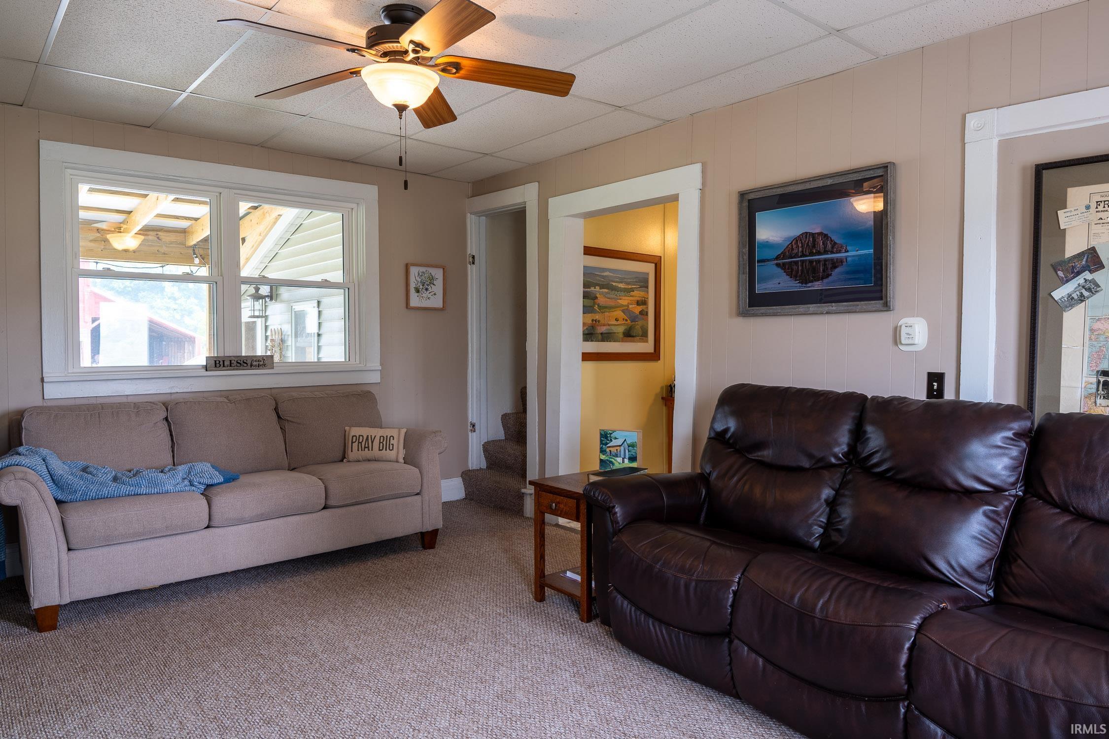 A unicorn in today's marketplace! 5 acres of rolling rural countryside in Howe, IN. Cute 1, 740 sq.ft. single family home with 4 beds and 2 full baths. ALL NEW windows, siding, gutters, entry doors, and patio cover in 2021. NEW metal roof in 2016 and tastefully decorated! Updated downstairs bathroom, remodeled upstairs master bedroom, newly graded and graveled driveway, a kitchen window made for bird lovers, and a cute office and sitting room off the living room. Outside, there is a 36' x 28' barn with concrete floor and metal roof, 36' x 13' lean-to, 48' x 20' 3-sided hay barn, and a 16' x 12' shed with new metal roof, new doors, and siding to match the house! Very productive hay fields and gorgeous, secluded views!